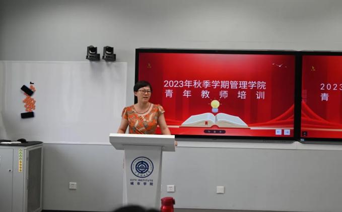 何亭副院长主要对学校和学院的教师管理和教学管理规章制度进行介绍与讲解。她结合现实教学案例,鼓励老师们转变教学观念、扎实教学技能、挖掘教学资源、融合课程思政等,并在培养学生全面发展方面提出了新理念、新要求。