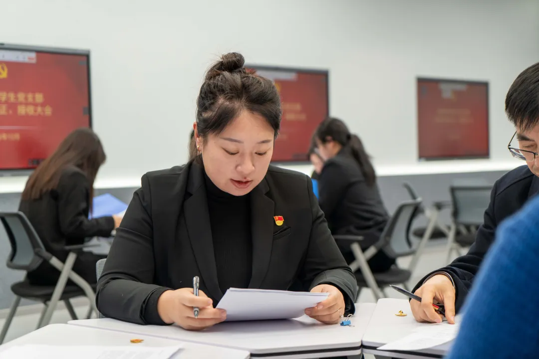 魏欣语等9名发展对象依次宣读入党志愿书。入党介绍人及与会党员充分发表意见。经大会正式党员无记名投票表决,由党支部书记宣布,一致同意接收魏欣语、霍奇哲、宋奡、衣桉漾、吕婵婵、刘依儒、伍文卓、王宇轩、张雨欣为中共预备党员。